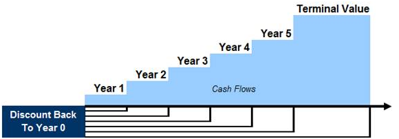 Free Cash Flows are discounted back to Year 0 (today) to solve for Enterprise Value, as displayed in this graphic: