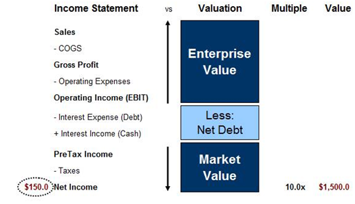 Typically, investment bankers and investors look at this equation the second way (the Net Debt/Net Value version). This is the one to be most familiar with.